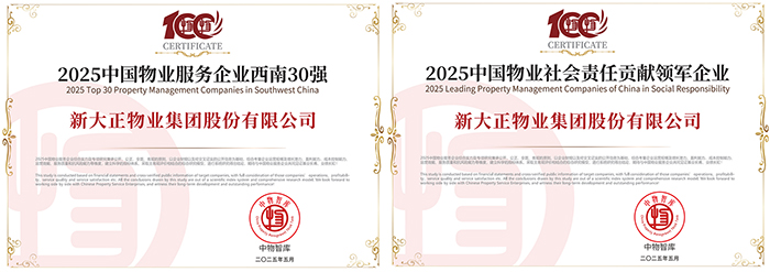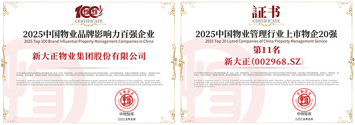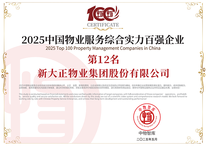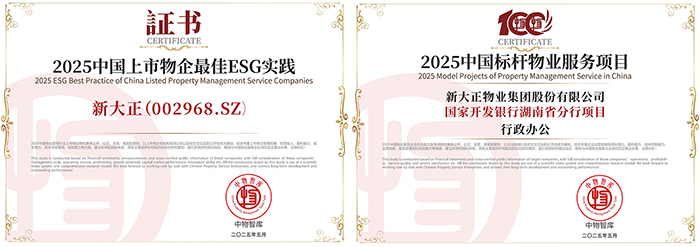 會上,發(fā)布《2025中國物業(yè)百強(qiáng)企業(yè)研究報(bào)告》,同期重磅發(fā)布“2025中國物業(yè)服務(wù)綜合實(shí)力百強(qiáng)企業(yè)”、“2025中國物業(yè)品牌影響力百強(qiáng)企業(yè)”及系列專項(xiàng)榜單。新大正憑借卓越的綜合實(shí)力、創(chuàng)新服務(wù)模式及社會責(zé)任擔(dān)當(dāng),一舉斬獲“2025中國物業(yè)服務(wù)綜合實(shí)力百強(qiáng)企業(yè)第12名”、“2025中國物業(yè)品牌影響力百強(qiáng)企業(yè)”、“2025中國醫(yī)院物業(yè)服務(wù)企業(yè)TOP10”、“2025中國金融類物業(yè)服務(wù)企業(yè)TOP10”、“2025中國物業(yè)服務(wù)企業(yè)西南30強(qiáng)”、“2025中國物業(yè)管理行業(yè)上市物企20強(qiáng)”、“2025中國標(biāo)桿物業(yè)服務(wù)項(xiàng)目―國家開發(fā)銀行湖南省分行項(xiàng)目(行政辦公)”等九項(xiàng)殊榮。其中,新大正首次斬獲“2025中國物業(yè)社會責(zé)任貢獻(xiàn)領(lǐng)軍企業(yè)”、“2025年中國上市物企最佳ESG實(shí)踐”榮譽(yù)稱號,彰顯了行業(yè)對新大正社會責(zé)任價(jià)值的高度認(rèn)可。